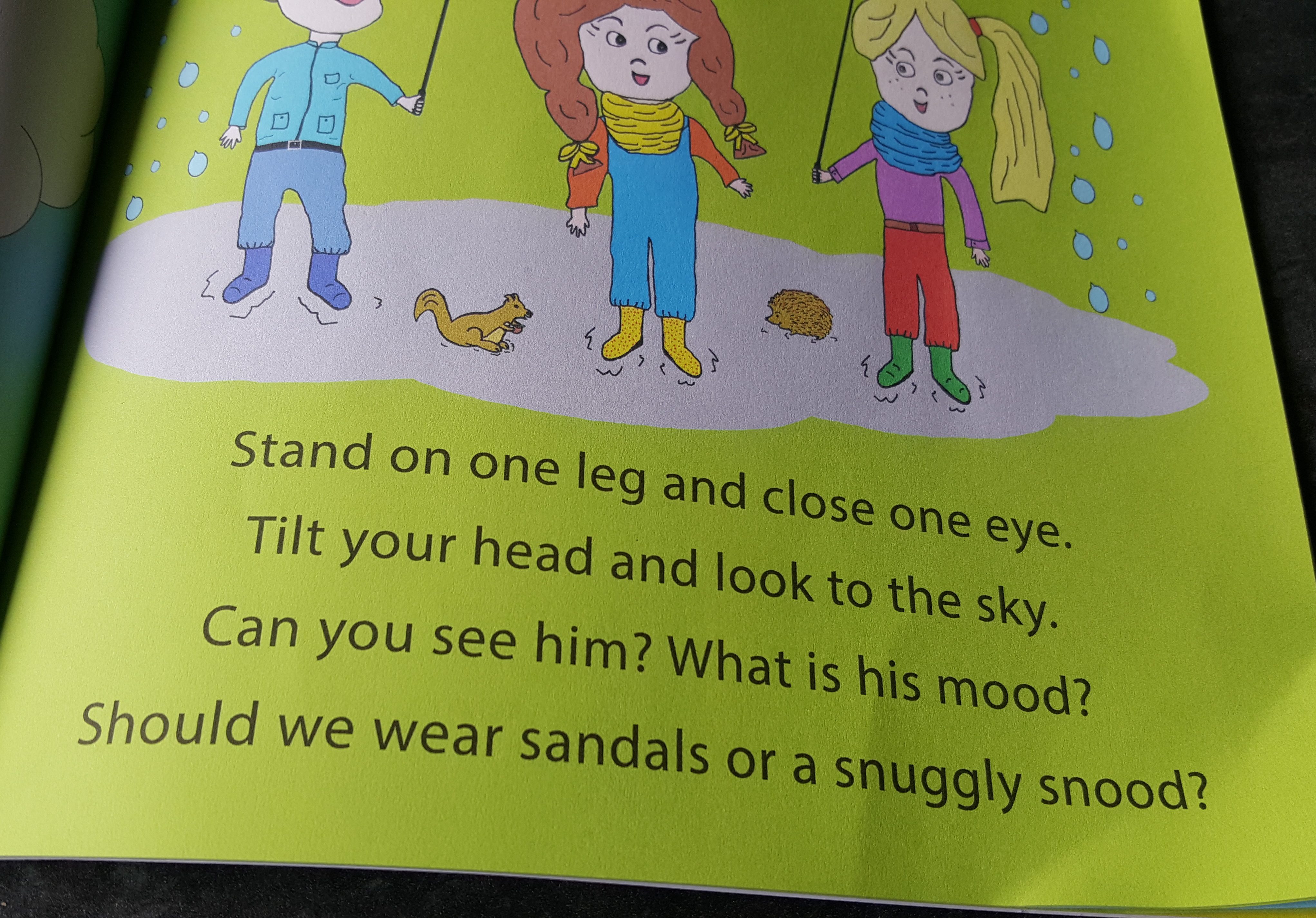 This is quite a simple book, but it does have a lot of learning going on without bombarding the child too much. Learning about the weather, days of the week, and other people’s feelings, which I think is really important at this age and this is a fun way to do it. The text within the book is large print so easily readable for those children that can already read, or are just learning. I like that there is the rhyme after every day’s emotion and weather; Jacob joins in with it and does the actions, even when we aren’t reading the book – that’s how much he loves it! When I am reading it to him and I ask should we wear sandals or a snuggly snood, he always gives me an answer – sometimes not the right one for the weather, but he is learning, which is what this book is all about.